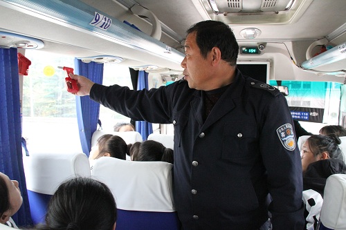 演练中,客运公司工作人员和同学们详细讲述有关乘车安全知识,再一次提醒乘车纪律:系好安全带、不要随意走动、不能大声喧哗、不能乱丢垃圾等问题。接着,又向同学们讲解了遇到各种不同突发事故应选择的逃生方法:遇到校车起火要紧捂口鼻,弯腰撤离;需要砸碎车窗时,用安全锤砸车窗四角最容易;客车侧翻时怎么打开车顶安全出口。同时还强调,在任何突发事件中,冷静、秩序、速度是险处逃生的三大要素。